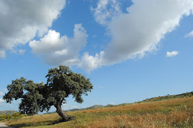 Pero al final, el naturalista, encuentra su premio, pues observas la dehesa, en este caso mixta de encinas y alcornoques; unos alcornoques a los que recientemente se les ha sacado el corcho y te muestran ése color llamativo que sólo los troncos de los alcornoques despojados de su piel, te pueden ofrecer, y entonces comprendes que merece la pena llevar los calcetines llenos de semillas molestas clavándose en tu piel, el agua caliente, el sol machacándote e incluso puedes dejar a las garrapatas que te quiten un poquito de sangre, porque también los alcornoques han perdido algo de su sangre y ahí están.